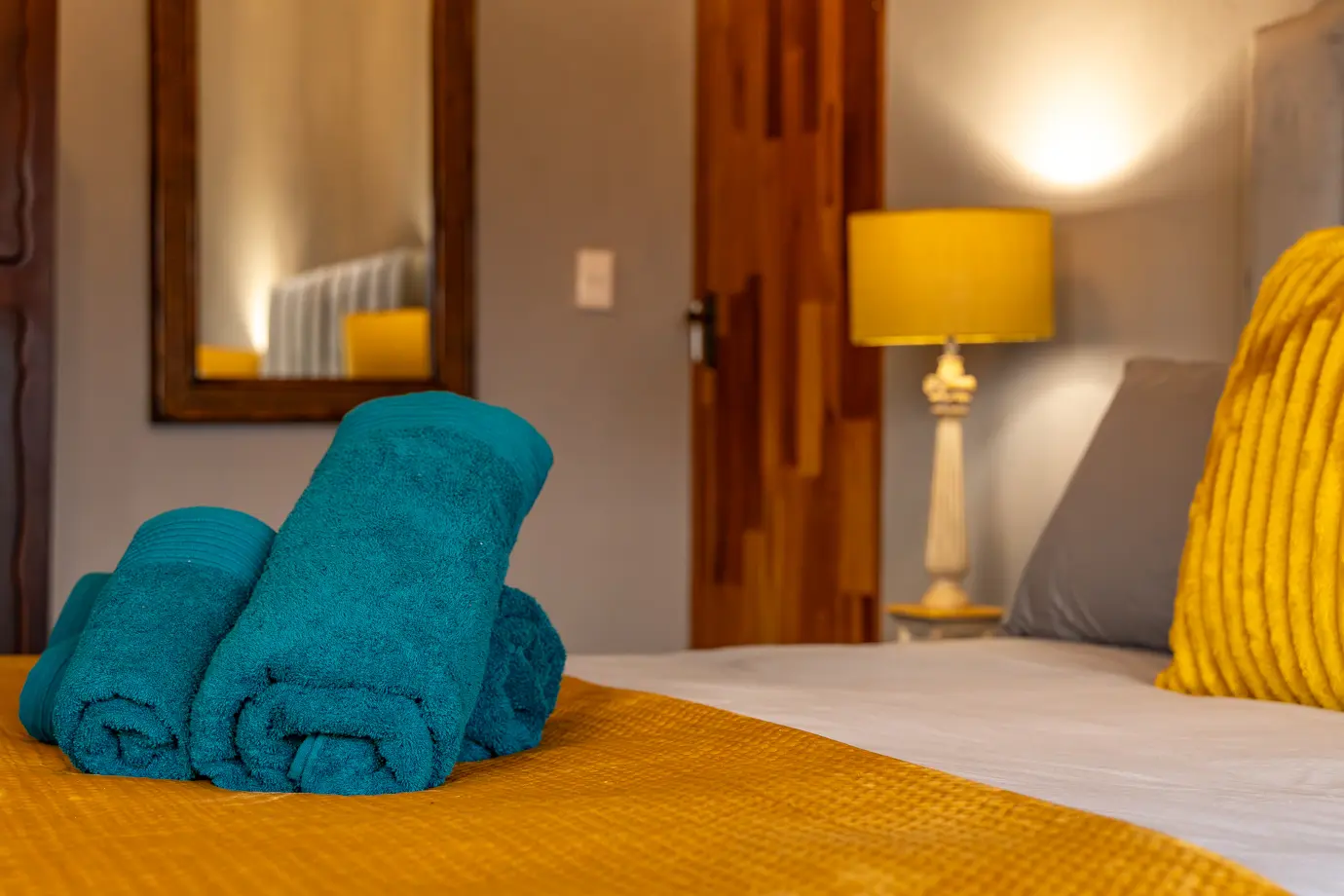 A nearby private bathroom includes a shower, toilet, and basin, with towels and essential toiletries supplied for your convenience. This setup provides privacy and comfort while keeping the cottage cozy and intimate.